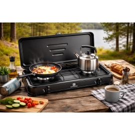 Réchaud à gaz pliable 2 feux 4.6 kW Bruleur inox + 2 cartouches gaz 450 gr...
