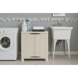 Armoire basse en polypropylène ARTPLAST. Couleur beige et taupe Meuble de rangement doté 2 portes 4 pieds et équipée de 2 étagères supportant jusqu'à 25 kg chacune. Idéale pour l'intérieur et extérieur. Résistant aux intempéries Verrouillable ( cadenas non inclus ) Dimensions : 700 x 470 x 970 mm. 100% Fabriqué en Italie en plastique recyclé et recyclable. Poids 14 kg