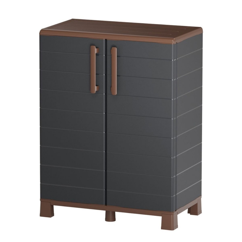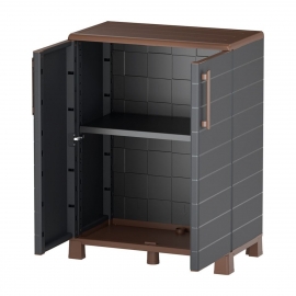 Armoire de rangement basse Portofino Art Plast en polypropylène recyclé, idéale pour garage, buanderie ou atelier. Robuste et résistante à l’humidité, elle accueille outils, produits ménagers, seaux, chaussures ou caisses grâce à sa tablette réglable. 20kg max/étagère Dimensions : 68 x 37 x 90 cm, charnières acier. Poids 7.9 kg.