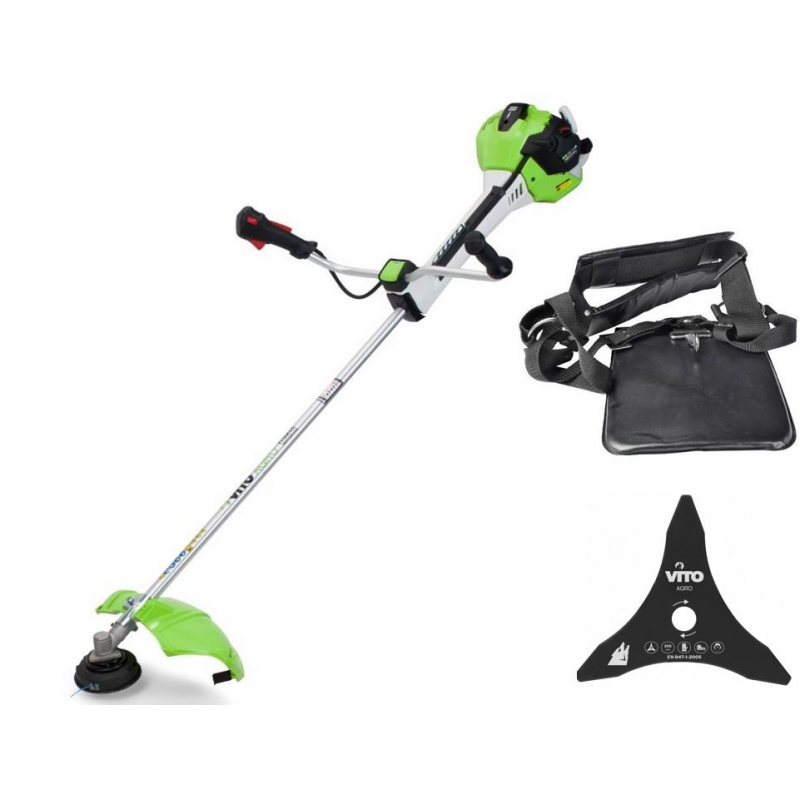 Débroussailleuse thermique VITO moteur à combustion 2 temps de 43 cm³. Puissance moteur 1,6 CV. Pompe d’amorçage manuelle. Système de démarrage facile. Système antivibrations. Largeur de coupe 255 / 305 mm. Livrée avec une bobine de fil avec tête automatique, lame 3 dents, clés, doseur de mélange et harnais de portage. Poids 9 kg.