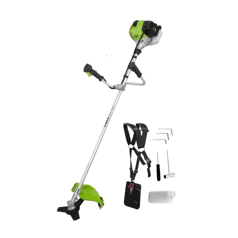 La Débroussailleuse thermique VITO est très puissante, doté d'un moteur à essence 2 temps 52 cm³, elle dispose d'une vitesse de coupe suffisante pour venir à bout de n'importe quel espace vert dense, sous bois ou friches et herbes difficiles. Sa largeur de coupe de 25.5 cm pour la coupe avec lame et 305mm avec sa bobine de fil est parfaite pour réaliser un travail efficace. Sa structure en Aluminium lui confère un confort de travail , car elle ne pèse que 9 kg . Livrée avec une lame 3 dents, des clés, un doseur de mélange et un gilet harnais de portage Le gilet fourni vous libère du poids de la débroussailleuse et vous permet de travailler sans contrainte.. Équipée d'un système anti vibrations pratique pour une longue utilisation , un système de démarrage facilité et une pompe d'amorçage manuelle. Indispensable pour entretenir vos espaces verts, vos terrains en friche ou vos terrains à hauts végétaux. Moteur VITO aux nouvelles normes EURO5 fiable et puissant.
