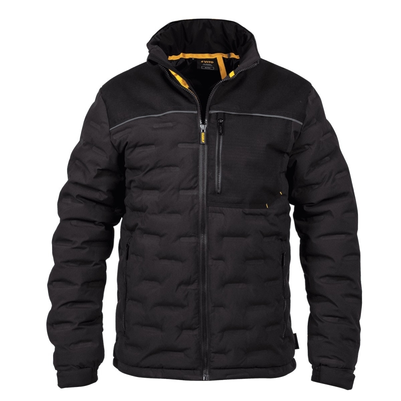 Veste Noire polyvalente ALPHA multifonctionnelle Taille XL VITO. Confort, durabilité et protection contre les intempéries : Froid, vent, pluie. Tissu respirant avec traitement déperlant (DWR). Multiples poches : 2 poches latérales zippées avec doublure, 1 poche poitrine zippée, 1 poche intérieure zippée pour portefeuille, et 1 poche intérieure. Poignets ajustables. Bandes réfléchissantes sur le rabat avant et arrière