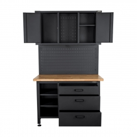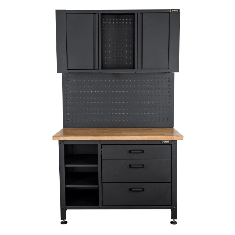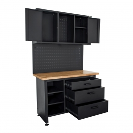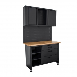 Armoire d'atelier métal et bois avec plan de travail VITO. Charge max 500 kg. Pour Rangements optimisés avec Etabli de garage en Acier noir laqué, composé de : 1 plan de travail Bois traité 36mm d'épaisseur, 3 tiroirs spacieux pour vos outils à main et 1 niche à 3 étagères, 1 panneau perforé range outils, un meuble supérieur à 2 portes à fermeture magnétique. Livré pré-monté. Dimensions 120 x 60 x H180 cm Poids 100 Kg