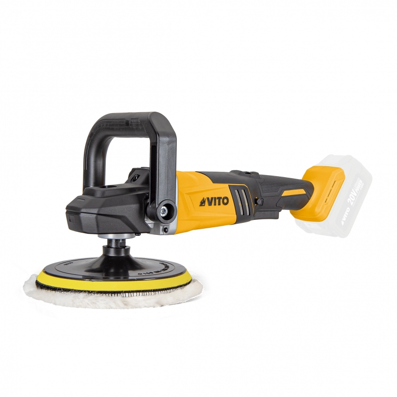 Machine à polir brushless à batterie 20V VITO Moteur : Brushless 6 Vitesses Boite de vitesse métallique Verrouillage de l'arbre. Tampon de Polissage Ø 180 mm. Filetage de l'Arbre : M14. Vitesse de Rotation à Vide : 800 - 2300 tours/min Compatible avec les batteries lithium de la Gamme VITO 2Ah, 4Ah, 6Ah. Chargeur et batterie vendus séparément Dimensions : 440 x 215 x 200 mm. Poids du Produit : 2.1 kg.