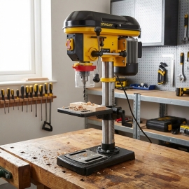 Perceuse à colonne STANLEY SXDP16720E 600W 9 vitesses Vitesse variable de 400 à 2 700 m/min pour s'adapter à différents besoins de perçage de 3 à 16mm avec protection de sécurité permanente Interrupteur de sécurité Course de la broche réglable jusqu'à 60 mm et capacité de la broche de 3 à 16 mm Poignée antidérapante équilibrée Capot supérieur avec micro-interrupteur de sécurité Interrupteur marche/arrêt de sécurité pour éviter tout démarrage accidentel Distance mandrin-colonne : 112.5 mm Diamètre de la colonne : 60 mm Plateau de 195 x 195 mm Poids: 28 kg.