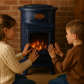 Le poêle à gaz Provence Bleu Saphir Mat séduit par son design traditionnel avec flammes réalistes effet feu de bois, recréant l’ambiance chaleureuse d’un foyer ancien tout en bénéficiant des avantages modernes. Sa construction en fonte véritable assure une excellente diffusion et rétention de chaleur, permettant de réchauffer uniformément une pièce de 40 à 80 m².