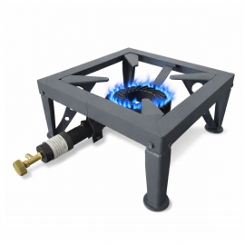 Support casserole et poêle. Système d'allumage Piezo électronique avec levier de verrouillage. Corps en Acier robuste. Autonomie : 2 heures.