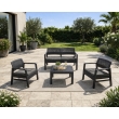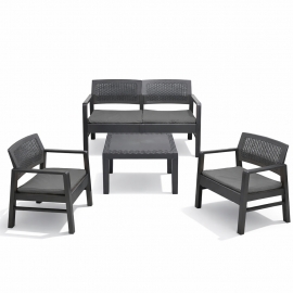 Petit salon composé de 1 canapé 121 x 58 x 74H cm, 2 fauteuils 64 x 58 x 74H cm et 1 table basse extérieur 60 x 47 x 40H cm. 4 coussins gris anthracite inclus.