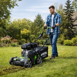 Le scarificateur thermique VITO est un scarificateur de gazon puissant conçu pour l’entretien des pelouses de grandes surfaces. Le scarificateur thermique s’utilise en général, au printemps et à l’automne, 1 à 2 fois par an et permet d’aérer le sol, d’éliminer la mousse et le chaume et de stimuler la repousse du gazon pour une pelouse plus dense.