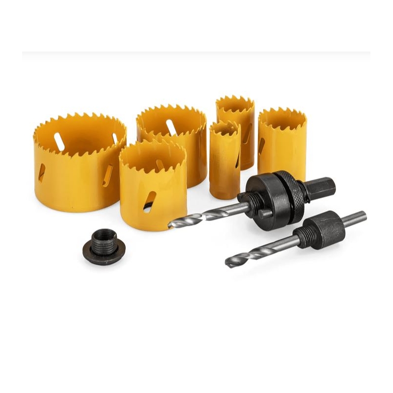 Set de 6 scies cloches mixtes VITOPOWER. HSS | 22 | 29 | 35 | 44 | 51 | 64 mm. Mandrin 14 - 30 mm | Mandrin adaptateur | Écrou hexagonal 32 - 152 mm. Jeu de 6 pièces avec mandrin, adaptateur et boîte de rangement. fabriqué en acier HSS pour garantir des coupes nettes, précises et durables sur le bois, le métal, le pvc et le plastique. idéal pour les travaux d’électricité, de plomberie, de menuiserie et d’aménagement. un coffret complet, pratique et polyvalent pour tous vos besoins de perçage!