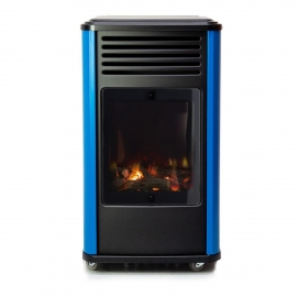 Chauffage d'appoint gaz 3.4 kW Manhattan noir et bleu. Design contemporain. Effet feu de bois. Puissant 3400 W. Fonctionne avec une bouteille de gaz butane 6 à 13kg. 3 niveaux de chauffe. Consommation max de 245 g/h. Chauffe un espace d'environ 40-80m². Grande autonomie. Allumage piezo. 4 roulettes. Dimensions : 51 x 37 x 67.5 cm. Poids 17 kg.