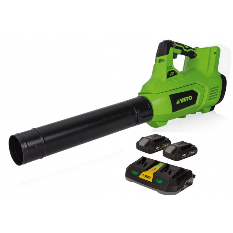 Souffleur sans fil VITO EGO LI 40V Débit d'air 750 m3/h - Vitesse max 150 km/h Parfait pour souffler et balayer les feuilles sans efforts Pack inclus 2 Batteries lithium 2.0Ah Grande autonomie de 1h environ à puissance maximum Chargeur rapide DOUBLE pour une charge simultanée Dimensions: 170 x 265 x 780 mm Poids 2,5 kg