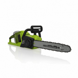 Tronçonneuse sans fil 20V moteur Brushless + 2 batteries LITHIUM 2.0Ah + Chargeur DOUBLE 20V Tronçonneuse électrique sans fil avec Lame Guide Oregon long 35 cm. Vitesse de la chaine : 0-19 m/s. Nombre de maillons : 52. Pas de la chaine : 3/8". Capacité du réservoir d'huile 160 ml. Classe d'isolation : II. Niveau de puissance sonore : 101 dB(A). Vendu avec 1 chaine, 1 guide, un protège guide, 2 batteries 20 V 2Ah, 1 chargeur double rapide. Dimensions 81 x 22.5 x 21.5 cm. Poids 3.6 kg.